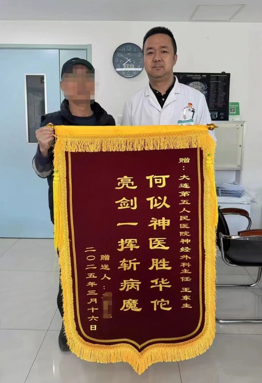 康复后的刘先生,满怀感恩之心,与家人一同来到大连市第五人民医院神经外科。他脸上洋溢着“劫后余生”的喜悦,手托两面鲜艳的锦旗,步伐稳健有力,让人很难想象,就在不久前,他遭受脑血管病痛的折磨。锦旗上 “何似神医胜华佗,亮剑一挥斩病魔” “白衣天使,爱心无限,精心护理,胜似亲人”几个烫金大字熠熠生辉,承载着刘先生一家沉甸甸的感激。刘先生见到曾全力救治自己的医护人员时,激动地快步上前,双手将锦旗展开,送到医护人员手中。“谢谢你们,是你们给了我第二次生命……”刘先生言语间满是深情。