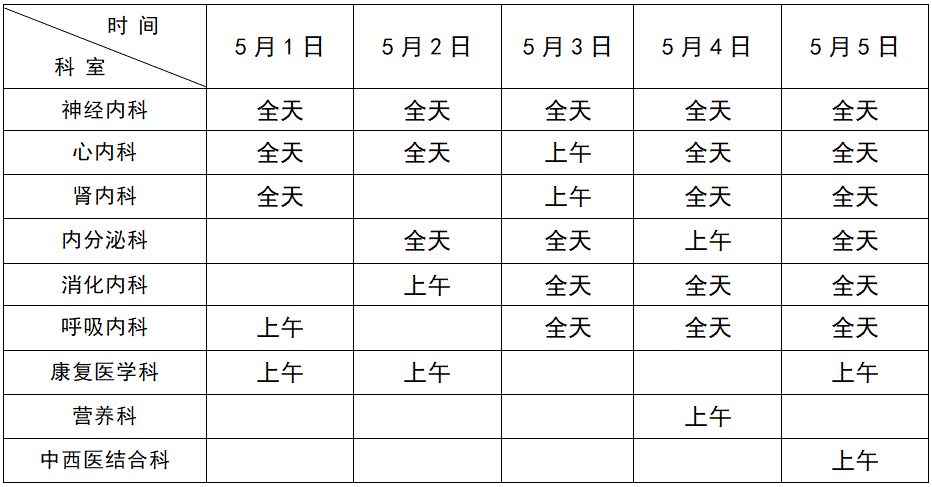 神经内科、心内科、肾内科、内分泌科、消化内科、呼吸内科、康复医学科、营养科、中西医结合科门诊出诊情况如下: