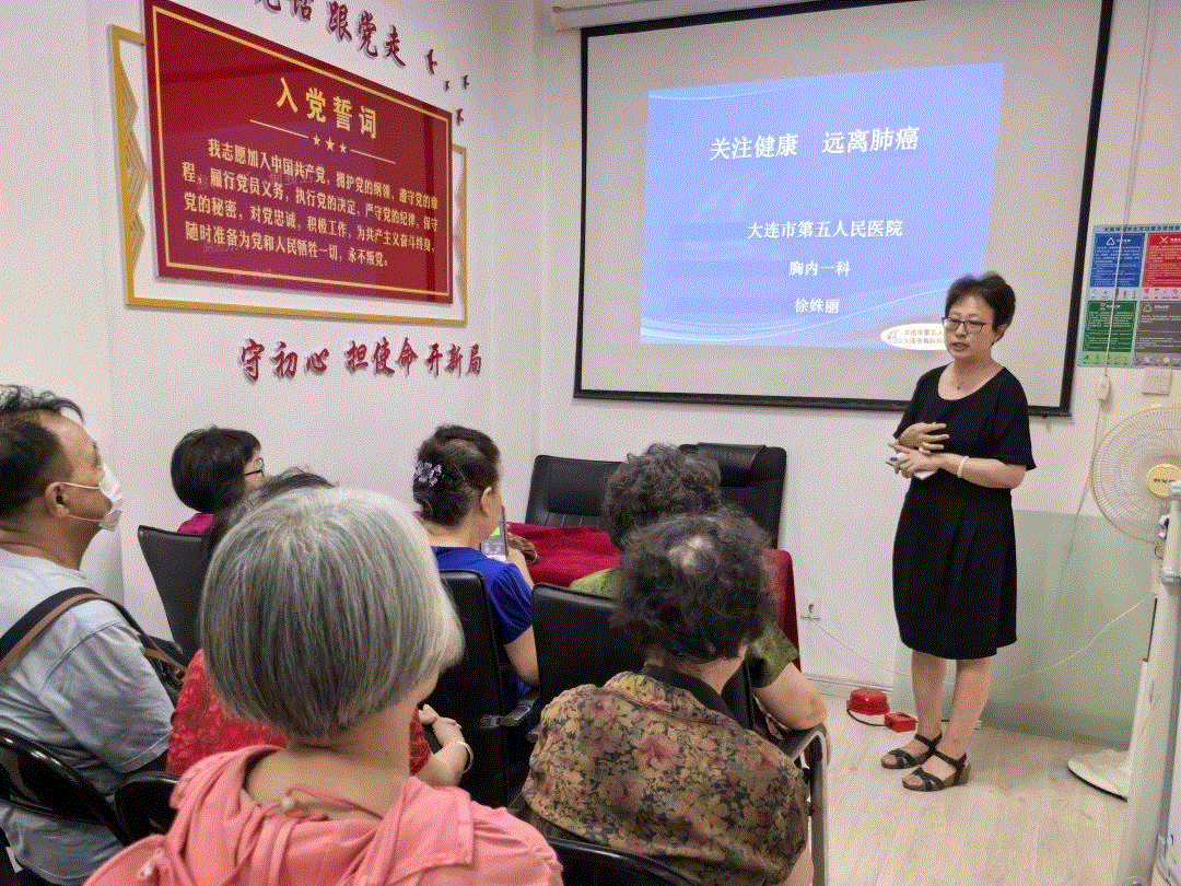 活动现场,大连市第五人民医院胸内一科副主任徐姝丽医生为居民们带来了“关注健康 远离肺癌”的精彩讲座。徐医生从吸烟、职业因素、家族遗传史、慢性肺部疾病等方面,详细剖析了肺癌的高危因素,帮助居民清晰地了解自己是否属于高危人群,从而有针对性地进行预防。