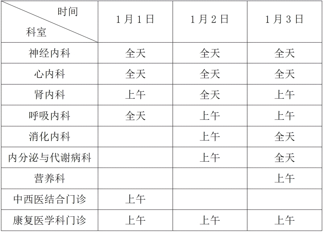 内科门诊、营养科、中西医结合门诊、康复医学科门诊出诊情况如下: