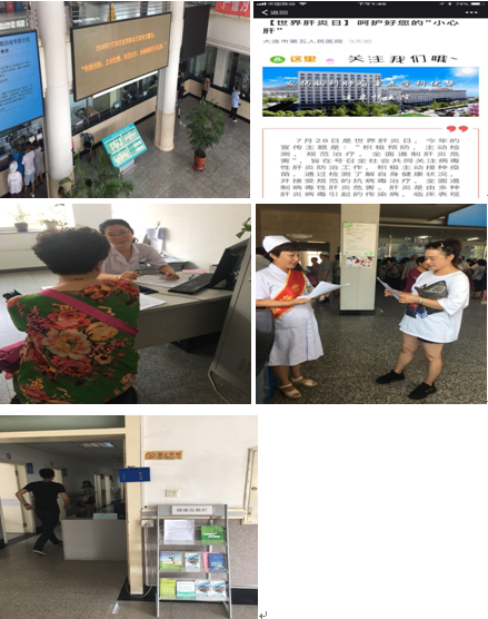为做好肝炎疾病防治宣传工作,根据大连市疾病预防控制中心工作要求,市五院于7月28日第八个世界肝炎日开展为期一周的世界肝炎日宣传活动。