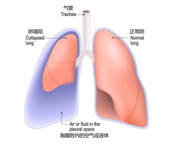 气胸是指因肺部疾病使肺组织和脏层胸膜破裂,或靠近肺表面的肺大疱、细微气肿疱自行破裂,使肺和支气管内空气漏到胸腔,压缩肺组织。通俗地讲,肺就像是轮胎,轮胎爆胎,漏气了。
