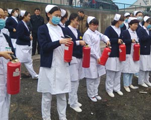 本次共有灭火行动组、通讯联络组、医疗救护组、后勤保障组、保卫警戒组、新闻摄影组等80余人参加了演练,分为灭火器演练、消火栓演练以及消防应急疏散演练3部分,院领导及10多个科室负责人到达现场进行了观摩。当日下午13:30演练准时开始,护士在住院部四楼走廊发现火情后,模拟报警,分别报告医院保卫科及办公室,医院紧急启动应急预案,按要求组织实施相关措施;现场职工报警后本着小火自救的原则迅速组织值班护士和医生对住院病人进行紧急疏散,同时分派人员使用灭火器、打开消火栓进行紧急自救。保安人员在接警后迅速赶到现场进行救援,现场警戒和疏散组在两分钟内将患者疏散引导至楼下安全地带。整个演练过程急而不乱,一切行动都按照应急预案有条不紊地进行,无事故发生,最大限度地保障了住院患者和全体员工的生命财产安全。