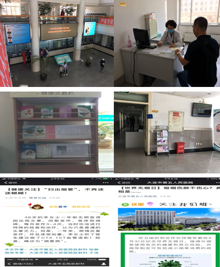 根据《大连市爱国卫生运动委员会文件》及《关于加强全市卫生计生系统控烟履约工作的通知》的文件要求,市五院在第31个“世界无烟日”到来之际,围绕“烟草和心脏病”的活动主题开展了为期一周的系列宣传活动。 一是利用门诊大厅LED大屏幕循环播放本次活动的宣传主题及相关知识;二是在院内摆放及发放主题为“烟草的危害”“吸烟相关的疾病”“戒烟的五大益处与方法”的控烟宣传单; 三是甄选专家在门诊诊室免费为来往患者及家属科普“吸烟有害健康,应如何戒烟”“吸烟与心脏病”等烟草危害的相关知识;四是利用医院微信公众号宣传“扫出烟雾,不在迷迷糊糊!”“吸烟伤肺不伤心,真相是什么?”等健康宣教内容。截至发稿,共计发放宣传单200余张、微信阅读量211人次。